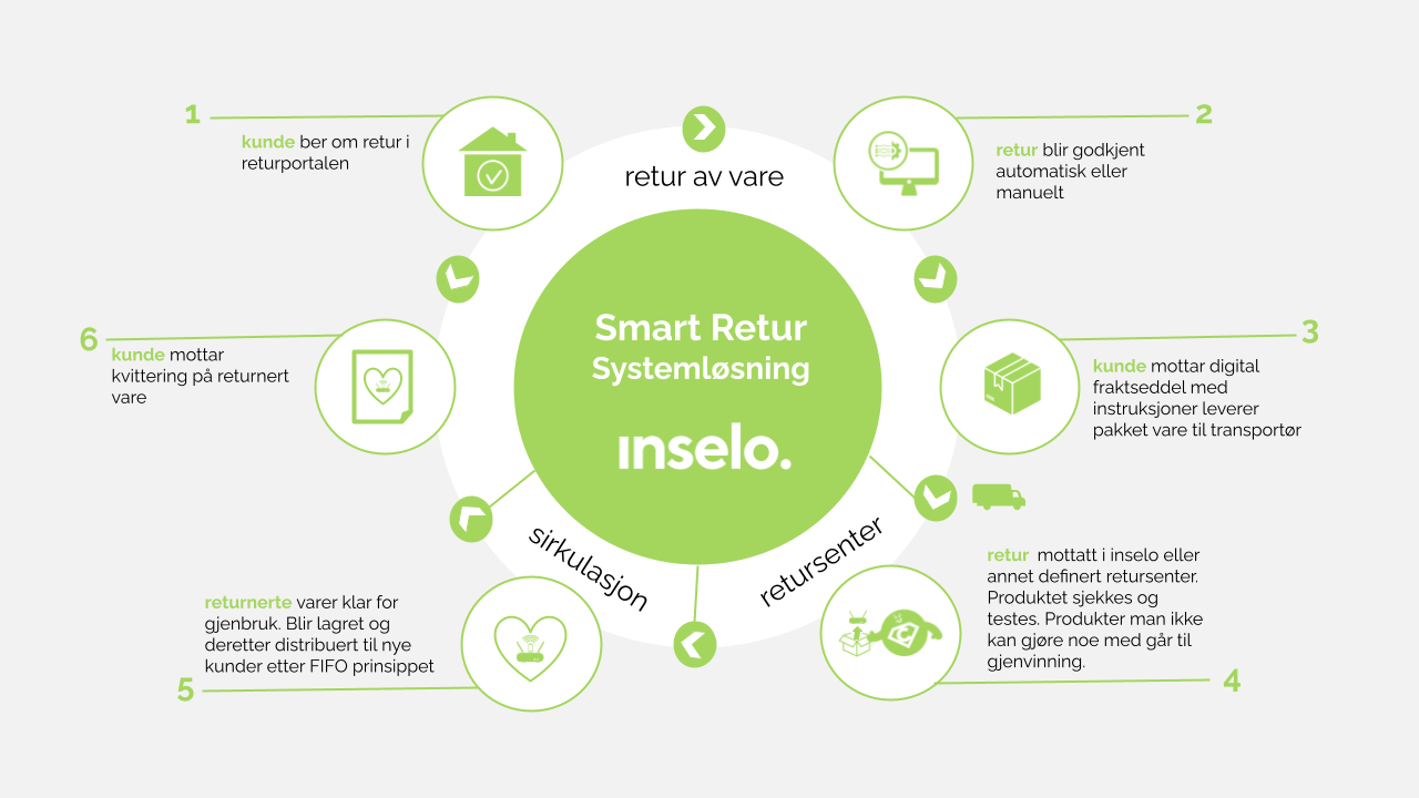 En bærekraftig returmodell er viktig i dag og vil bli en nødvendighet i fremtiden. Vi har jobbet med retur siden 2011 og mottar 400 000 returer i året. Med Inselo får du retur håndtert lokalt i Norge. Vi har kompetansen og systemene for en å skape en sømløs returprosess fra kunden til produktene når vårt retursenter. Gjennom industrielt håndverk sikrer vi deretter restverdi, slik at retur produkter kan gjenbrukes av neste kunde.